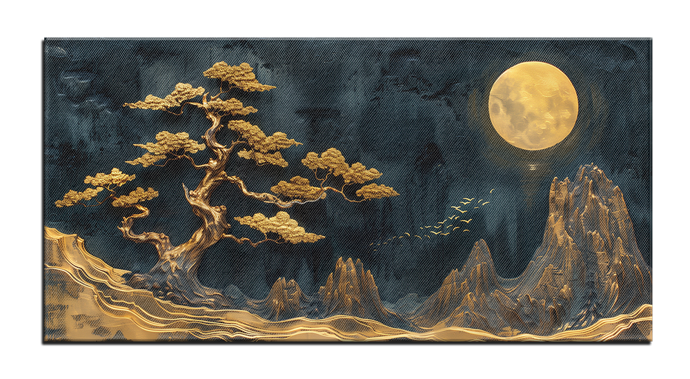 Позолоченная картина дерево на фоне гор и луны  напечатана Ультрафиолетовыми чернилами, которые не теряют цвет. Материал картины холст. Позолота методом фольгирования поталью. картина наполненная гармонией и спокойствием.