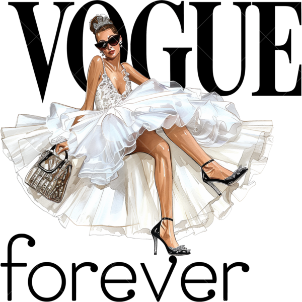 Термонаклейка девушка в белом платье с надписью "Vogue"  - стильный акцент для одежды. Легко наносится, устойчив к стирке, долго сохраняет насыщенность цветов, подходит для различных материалов.