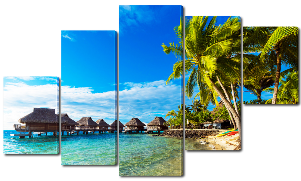 Тропический пляж, пальмы и бунгало на воде